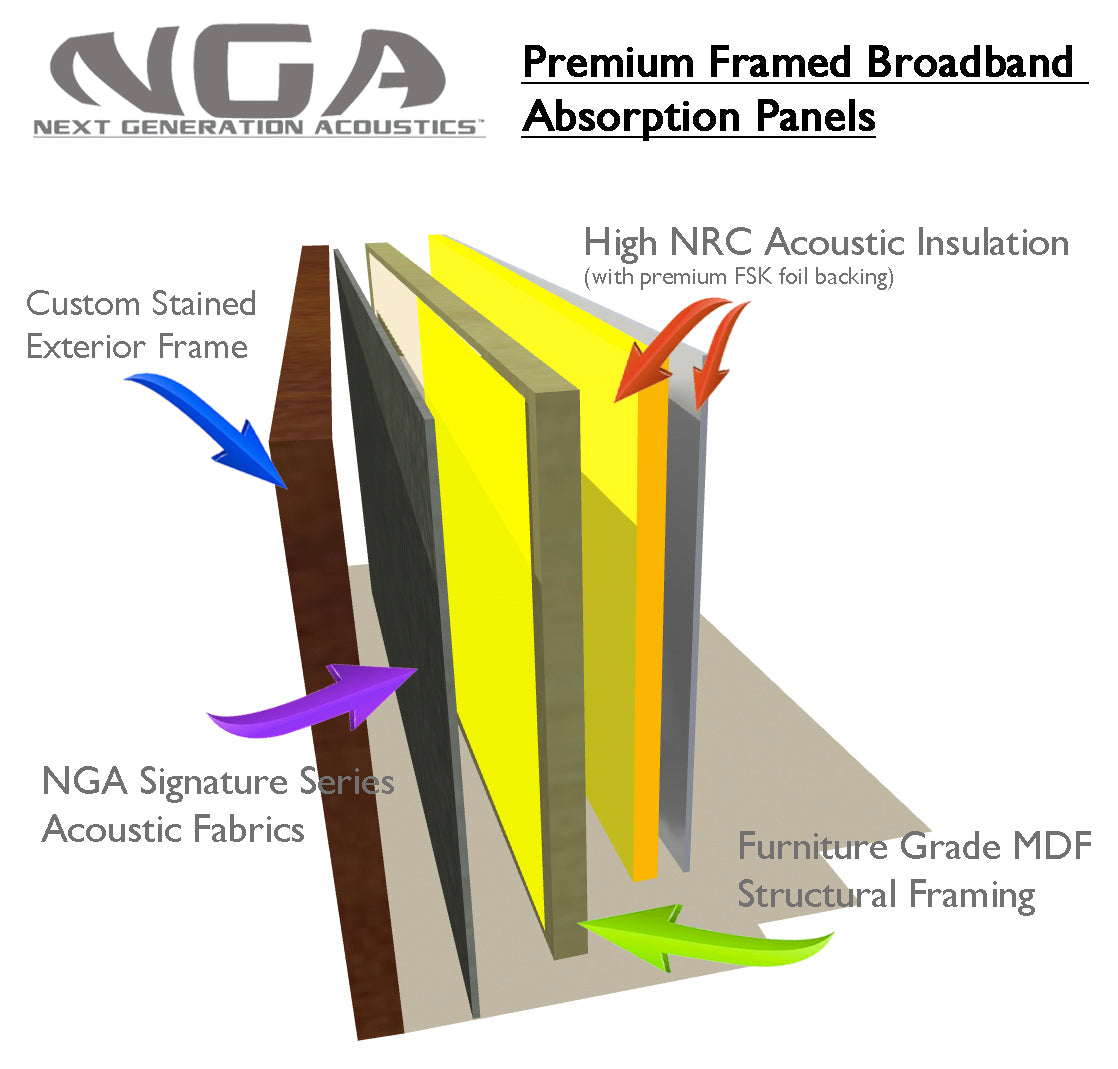 Next Generation Acoustics panels are meticulously crafted to deliver precise frequency response, thanks to the specific, high-quality of materials we use. By integrating dense acoustical insulation, Class-A fire-rated acoustical fabric, and durable wooden framing, these panels ensure accurate sound absorption across a wide spectrum of frequencies. This thoughtful material selection is essential for achieving natural, clear sound, effectively eliminating the distortions commonly caused by inferior treatments.